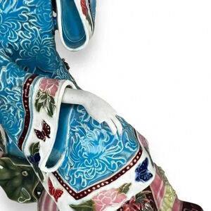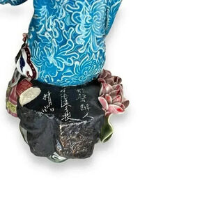 Add a touch of elegance to your collection with this vintage 10-inch Chinese porcelain figurine of a lovely ShiWan belle. This exquisite piece features intricate detailing and vibrant colors, showcasing a lady gracefully seated while holding a parasol.