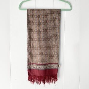 The product is a vintage 100% silk scarf with a geometric pattern in burgundy, yellow, and pink colors. It features tassel fringe accents and measures 25" in length and 11" in width. Made from silk satin, this classic rectangle scarf is perfect for all seasons and can be styled in various ways to complement different outfits. The timeless design and high-quality material make it a versatile and stylish accessory for both men and women.