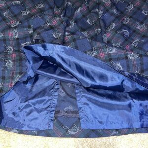 This vintage Pendleton skirt is a timeless piece that can be worn for various occasions. The plaid pattern and pleated design make it a great addition to any wardrobe. The skirt is made of a knit fabric blend of rayon and wool, making it comfortable to wear during any season. It features a mid-rise and a midi length, with a button closure and pockets for convenience. The skirt is also lined and requires dry cleaning only.