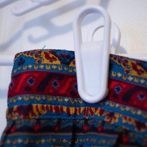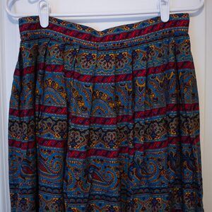Vintage paisley print midi skirt with a vibrant jewel-tone color palette. This rayon skirt has a swishy, flowy drape—perfect for pairing with a slouchy knit or boots for that fall boho vibe. The jewel tones and paisley striping give off a '90s retro meets artsy eclectic mood.