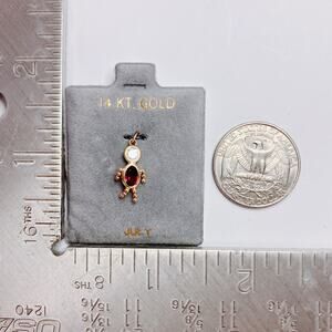 A playful July birthstone charm / pendant in solid 14K gold, this petite figure pendant pairs a vivid red glass stone with a sparkling clear accent for a whimsical, keepsake touch.