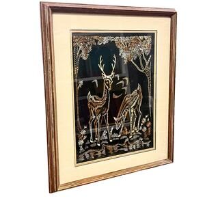 VTG 1930s Embroidery Under Glass DEER ART Framed Doe Buck Forest Stream 18.5x22"