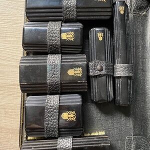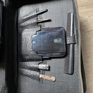 13 pieces in leather case. For all a gentleman's grooming needs. Art Deco flourish and lines. Great for set/display too. No stamp/Label:, just Capital on suit brush handle. Very good condition for age. The tweezers, nail clippers and file are modern replacements. See pics. Sold as is.