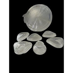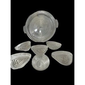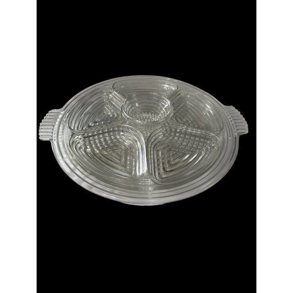 Authentic 1938-43 Anchor Hocking clear Manhattan large relish tray with unique triangle inserts. Perfect for serving at gatherings or as a vintage decor piece. Set consists of large tray, relish dish and 5 triangular relish dishes.
