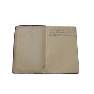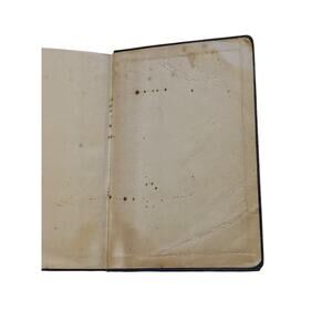 Cover shows heavy wear with creasing, scuffing, and some fading to the gold lettering. Pages have age toning, staining, and some foxing throughout. Some water staining and waviness present, especially on the opening and end pages. Previous owner’s name and handwritten notations appear inside the front cover. Binding is intact but shows age and handling wear. Book has “vintage” smell.