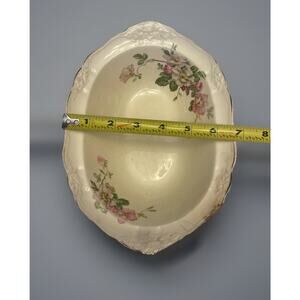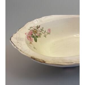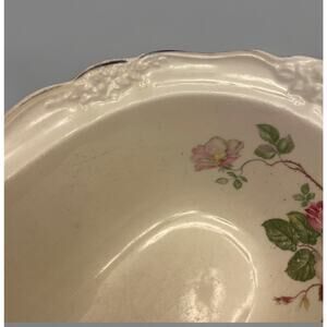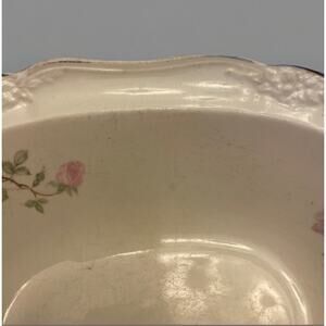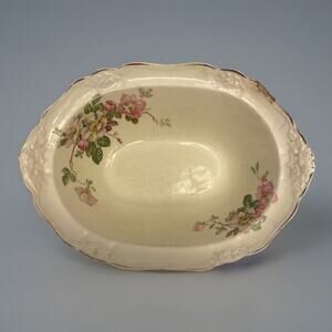Crafted in the heart of West Virginia, this vintage TS&T, Taylor Smith & Taylor, vegetable bowl is a testament to the timeless beauty of early mid-century design. The oval shape and cream background adorned with wild roses create a pastoral charm perfect for a modern farmhouse or cottagecore aesthetic. Made from durable semi-vitreous china with a feldspathic glaze, this piece hails from the 1945-1955 era, boasting a high-fired ceramic mold and after-glaze technique that ensures its beauty at the table of a modern farmhouse or to display in a collectors gallery.