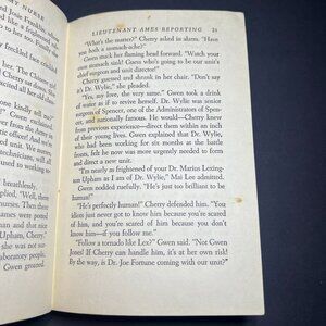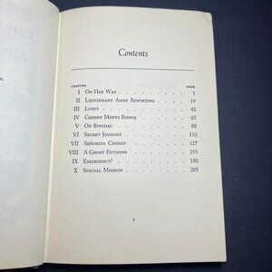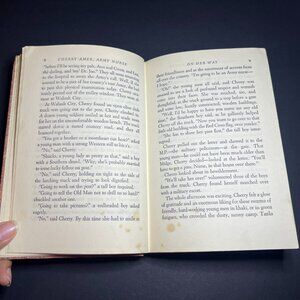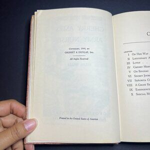 Selling a Vintage 1944 "Cherry Ames Army Nurse" Hardcover Book by Helen Wells. Published by Grosset & Dunlap. It has a stamp and tiny scribble on the first page, a few spots on some of the pages, and a stamp and some damage to the inner back cover (all shown in the pictures).