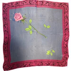 About 30" square, this scarf is a work of art. It has a flocked rose on one side. There is a title at the bottom, hidden in the border, " A Rose." In excellent condition, hand-rolled.