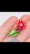 Features: Sculpted red petals with pink glass center; enameled green leaf and stem; kitschy mid-century motif; charming size