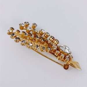 A cascade of rhinestones sweeps across a gold tone setting, capturing the mid-century fascination with radiant spray designs. This brooch pairs sparkle and sculptural form in a way that instantly recalls the glamour of the mid century.