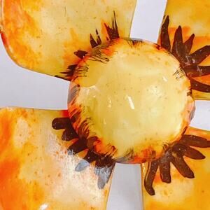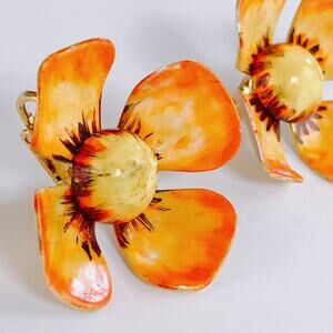 Features: Sculptural flower shape; curved petals; layered construction; clip-on backs; vivid hand-painted enamel; bright, energetic mood