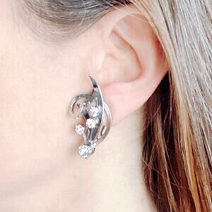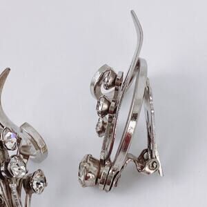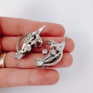 Sculptural mid-century clip earrings in bright silver tone send prong-set crystal rhinestones arcing up the ear—clean, dimensional cocktail sparkle with classic 1950s lift.
