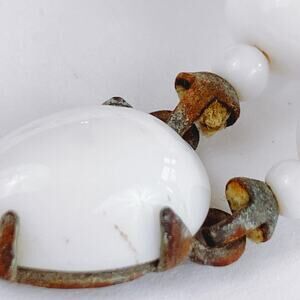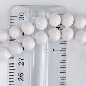 Features: Double-strand construction; hook clasp; choker length; molded milk glass beads; white cabochons; hand-knotted between beads