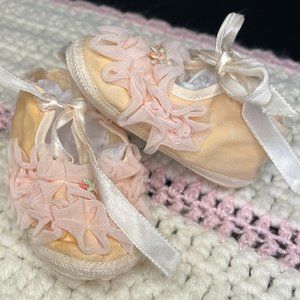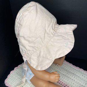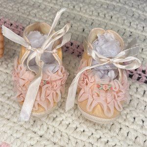These are the sweetest baby girl booties from the 50s with tags still on them from Mrs. Days Baby Ideal Shoes Size 1. The shoes have some yellowing from age but no damage to note. The bonnet was sold to me as a set with it so my guess is they were worn together. The bonnet does have a few spots on it and I have not tried getting them out. This would be great for a christening or newborn photo shoot! They are just precious!