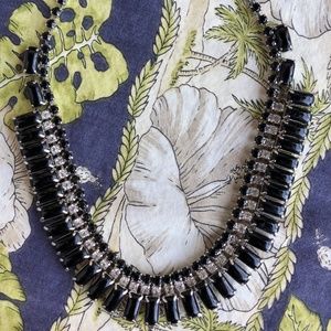 Black glass and rhinestone. Rectangular black stones. Beaded prong set glass bead chain. Ornate centerpiece. Rhodium over metal in back. Adjustable. Choker style. Hook fastening. Possibly By Gale (?). Very good vintage condition. Only thing we see is that one rhinestone is darker than the others, maybe a replacement. See pics. Sold as is. Measurements: Size of center piece 9 x .75" Total length from 12 to 13.5" 34 grams