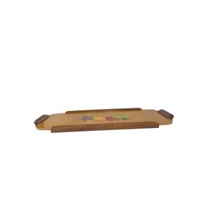 This is a vintage Rio Grande Ware serving tray made of wood with hand-painted finish. It has handles and is in the shape of a rectangle. The tray is large, measuring 9 3/4 inches in length and 21.5 inches in width, with a height of 1 inch. It features a medium brown wood tone and multicolor fruit design. The tray is an original piece from the 1950s and is handmade.