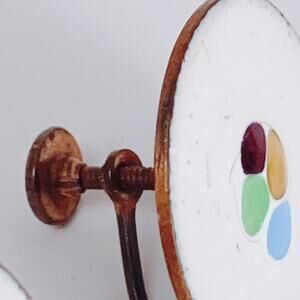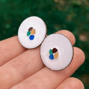 Features: Screw-back closure; abstract multi-color enamel inlay on white enamel disk