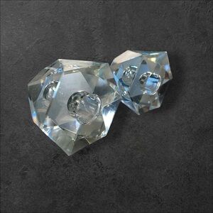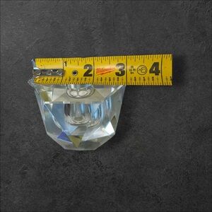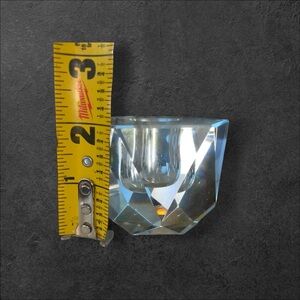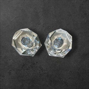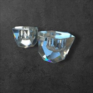 Featuring a geometric faceted design, these clear crystal holders sparkle beautifully under light and create a glamorous mid-century display. Each measures approximately 2” tall x 3” wide, perfectly sized for taper candles.