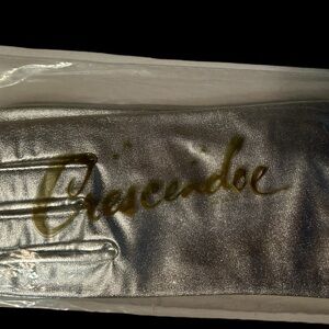 VTG 1950s Silver clutch with NIB Crescendoe matching gloves. Like new condition except for one interior spot that looks as if there was a brand sticker or price tag. No signs of use. Gloves fit perfectly in the matching clutch bag.