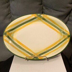 Vintage 1950's Vernonware Gingham 12.5" Long Ceramic Platter-Hand Painted Under Glaze with Yellow & Green Plaid Design. Platter measures approx. 12.5" Long & 9" Wide. Made in California, USA.
