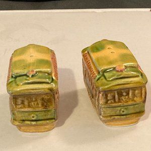 VTG 1960 Ceramic San Francisco Cable Car/Streetcar/Trolley Car Salt & Pepper Shakers-Brown & Green with stoppers. From SNCO IMPORTS-Japan. Measures approx. 2.75" Long and 1.75" High- 1.5" Wide. San Francisco is well known for Cable Cars.