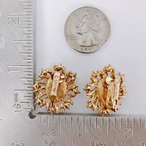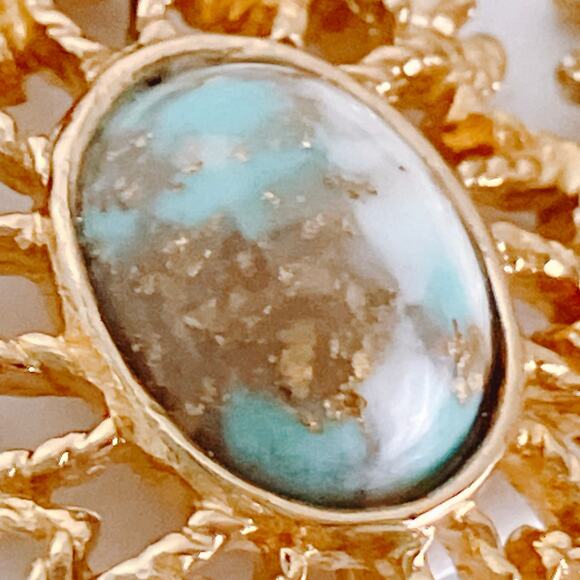 Features: Signed clip-on earrings; textured sunburst design; faux pearl accents; resin turquoise-look cabochons with matrix effect; mod aesthetic; collectible vintage jewelry