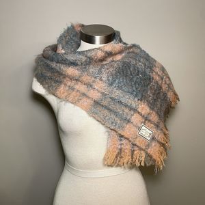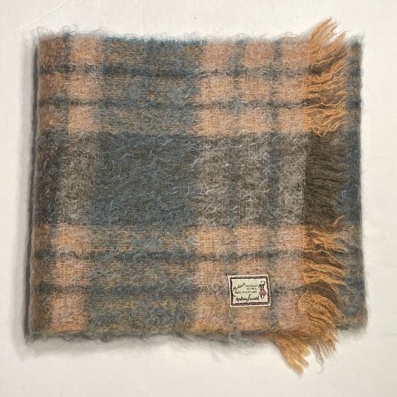 VTG 1960s Andrew Stewart Mohair Scarf Peach Blue Plaid Scotland Fringe