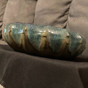 Vintage 1960's Brush McCoy Scalloped Pottery Planter or Rose Bowl Vase-Beautiful Blue & Green Drip Glaze with Olive Green Bottom. Measures approx. 8.5" in Diameter & 3.5" High.
