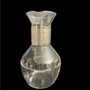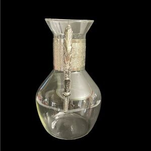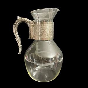This elegant glass pitcher features a detailed silver handle. Perfect for serving beverages in style.