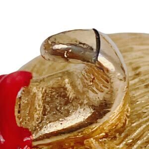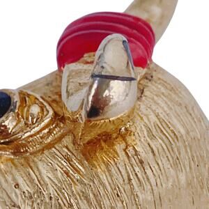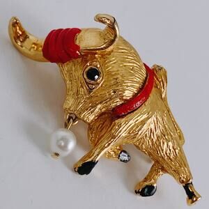 Features: Figural bull motif; textured gold tone body; red enamel collar and horn wrap; faux pearl dangle accent; black enamel hooves; cabochon eyes; rollover safety clasp