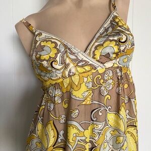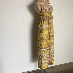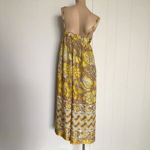Loungewear then but streetwear now. Yellows and tan with some white acetate that feels like silk. Skinny straps. Fairly deep V Neck. Wide elephant legs. Label: Vanity Fair. Excellent vintage condition. No real issues of note. Freshly cleaned. See pics. Sold as is.