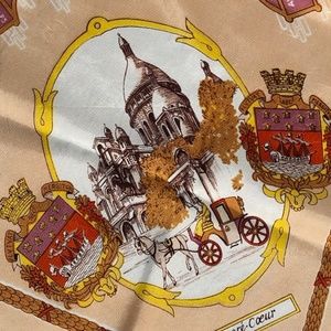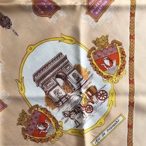 Silk acetate. Orange, brown, black, yellow and white with a pretty light orange background (approx. Pantone 720). Great illustrative MCM design of all the sights! Eiffel Tower. Sacre Coer. Arc de Triumph. L'Opera. Notre Dame. And street signs. No label, removed by previous owner. Excellent vintage condition, freshly cleaned, with no issues of note just one small spot near Place Pigalle that didn't fully lift. Very faint. See all pics. Sold as is. Flat Measurements: 31 x 31"