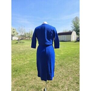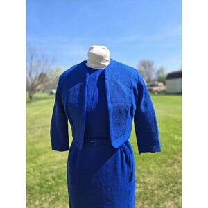 1960s 3pc royal blue knit pencil dress with jacket and belt. Has metal back zipper. Fully lined.