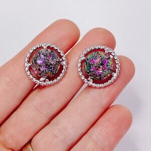 Rainbow cabochons glow with shifting greens and violets, their carnival-glass sheen caught in silver tone rope circles that echo the vibrant evenings of the late 1960s and early 1970s.