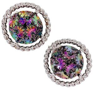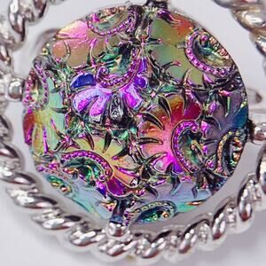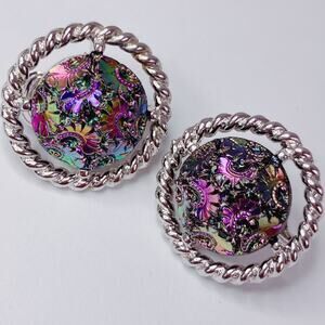 Features: Signed clip backs; domed carnival glass-style cabochons with floral and scroll pattern; silver tone twisted rope frame; clip-on