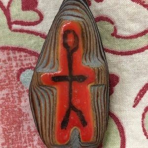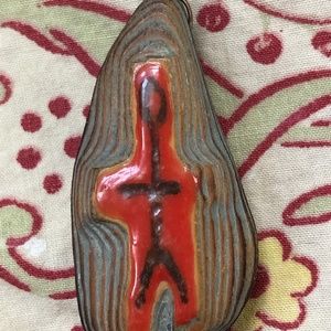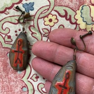 Long dangle earrings. Driftwood with orange enamel painting. Stick people. VERY light - 3 grams each. Screw back, copper. Measurements: .75 x 2.5inches. Unmarked. Very good vintage condition. No real wear. See pics. Sold as is. 2021621