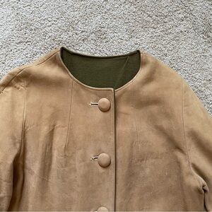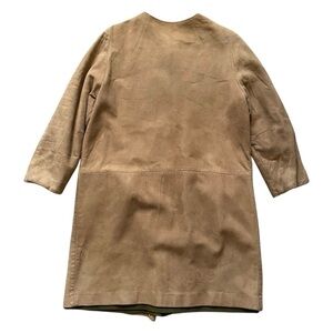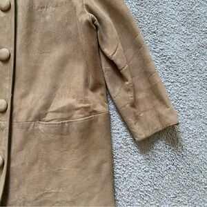 Features: A beautiful tan leather coat in a midi length. It has two pockets and is lined with a heavier fabric in a lush dark olive color. Great for the fall or chiller spring days.