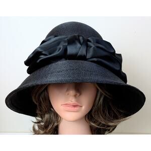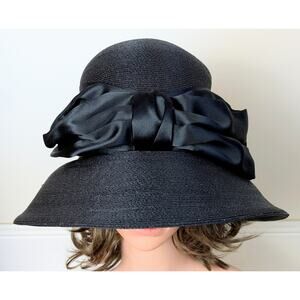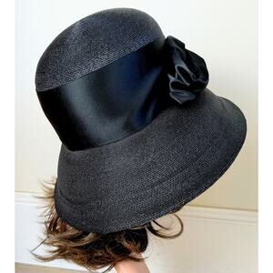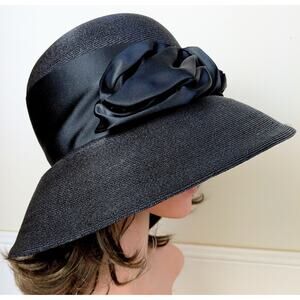 Elegant mid‑century designer Yvette Brillon wide‑brim hat in fine black woven strawcloth trimmed with a dramatic black satin band and sculpted bow. This authentic piece from renowned Canadian milliner Yvette Brillon captures the sophisticated elegance of the early 1960s. Its graceful, dramatic silhouette recalls the iconic hats worn by Audrey Hepburn in classic films of the era — timeless, chic, and beautifully feminine.