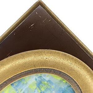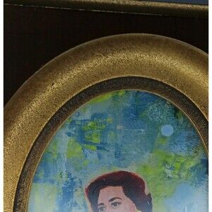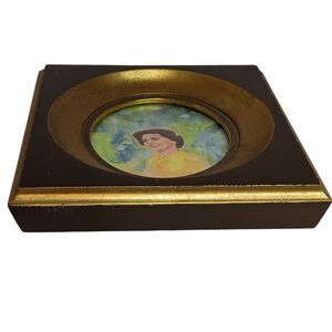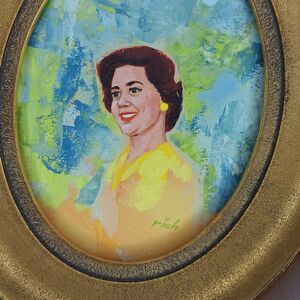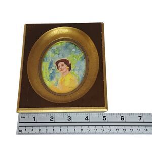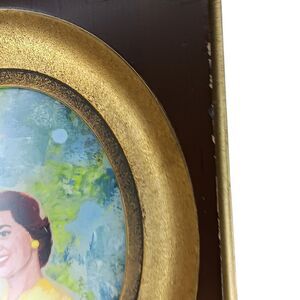 VTG 1963 Miniature Portrait Of Woman In Yellow Dress Blue Background Gold Frame