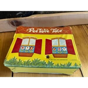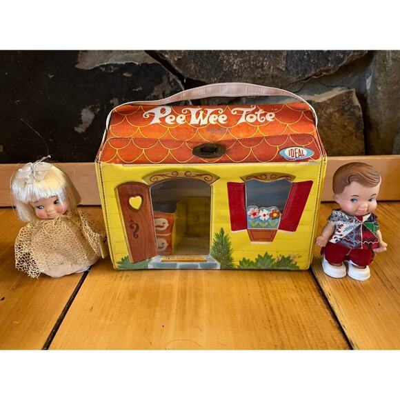 VTG 1966 Ideal Peewee doll tote house w/ 2 Uneeda Peewee dolls. Girl & Boy