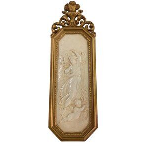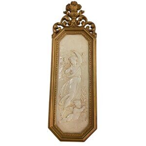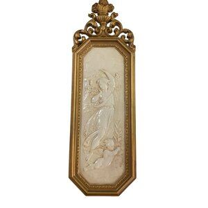 This intricately crafted vintage wall plaque set features gold-toned frames and ivory angel reliefs. Made in the USA, these pieces add timeless elegance.