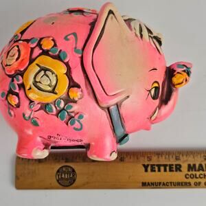 Vintage 1960 hot pink floral embellished hot pink elephant bank is in fair used condition