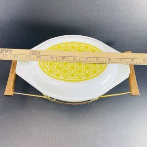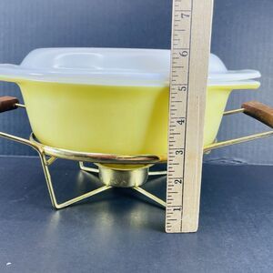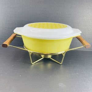 * Components: Includes a yellow Pyrex oval casserole dish, a glass lid, and a metal cradle warmer.