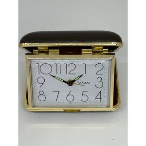 Classic 1970s Bulova analog wind-up travel alarm clock featuring a gold-tone folding case. Perfect Mid-Century style for your bedside or desk.