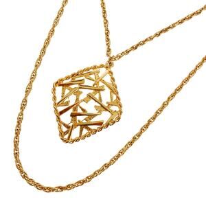 Features: Large geometric pendant; openwork abstract bar design; rope chain border; long rope chain with spring-ring clasp; bold statement scale; can be worn long, doubled, or tripled