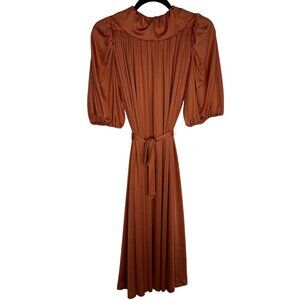 VTG 1970s Sz XL Copper Puff Sleeve Flowy Blouson Dress Peter Pan Collar & Belt