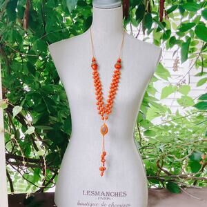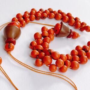 Condition: Very good used/vintage condition; scattered surface wear including scuffing, edge wear on some beads visible on close inspection; one bead at the drop shows a drilled hole chip; no structural issues; see close-ups. Note: Surface markings and natural voids are part of the organic structure of tagua and do not affect the integrity or durability of the piece. Ships from a smoke-free environment.
