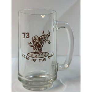Vintage 1973 glass beer mugs featuring "Year of the Bull" zodiac design. A rare collectible set of 2 with bold imagery—perfect for display or gifting!