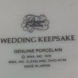 This beautiful vintage wedding keepsake box is a perfect find for anyone celebrating a special anniversary, or for a collector of nostalgic home decor. The hexagonal box is made of genuine porcelain and features a lovely graphic of two doves holding a heart, surrounded by the sentimental phrase, "love keeps on growing but never grows old." The base of the box is marked "Wedding Keepsake, Genuine Porcelain, WWA, Inc. ©1976, Made in Japan." The box opens to reveal a clean, white interior, perfect for holding small trinkets, rings, or other special mementos.