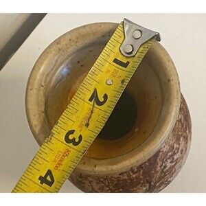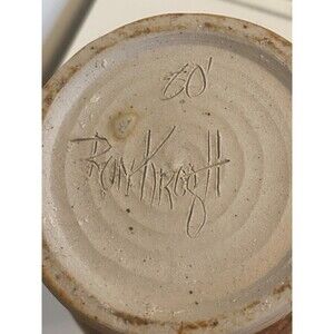 Small hand-thrown vase by Ron Krogh. Signed and Inscribed with the Artist's name and year, 1980. Has a nature scene with trees on a neutral beige background. Matte finish. Measures about 8" tall and 4" wide.